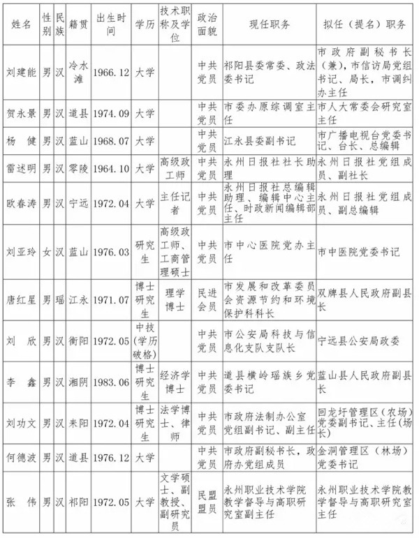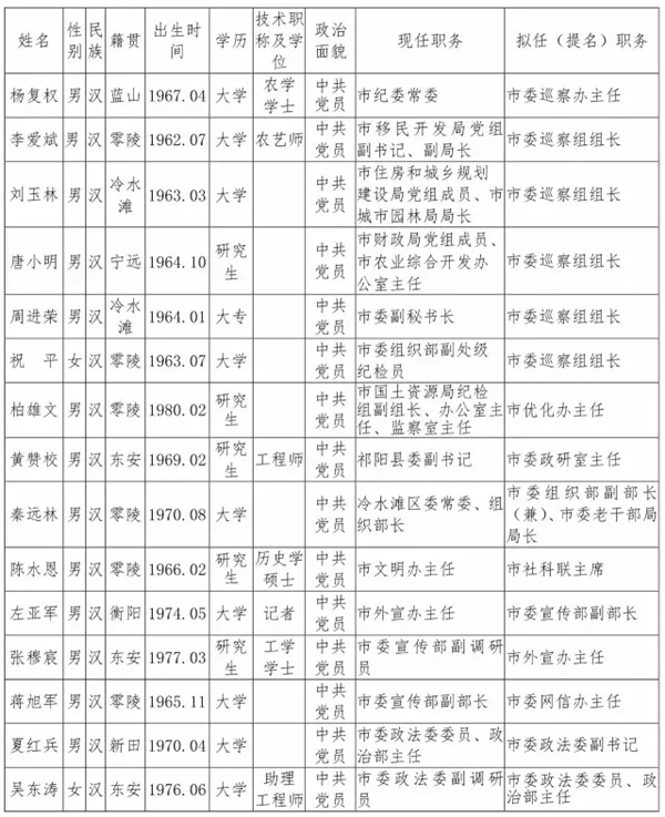 为加强对干部选拔工作的监督,提高识别和任用干部的准确程度,现对永州市委常委会议研究决定的下列27名拟任(提名)人选进行任前公示: