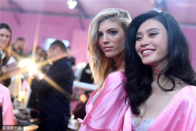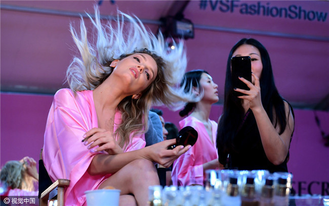 当地时间2016年11月30日,2016维多利亚的秘密内衣秀(Victoria's Secret Fashion Show )后台,奚梦瑶、安布罗休等超模酥胸半露忙梳妆。